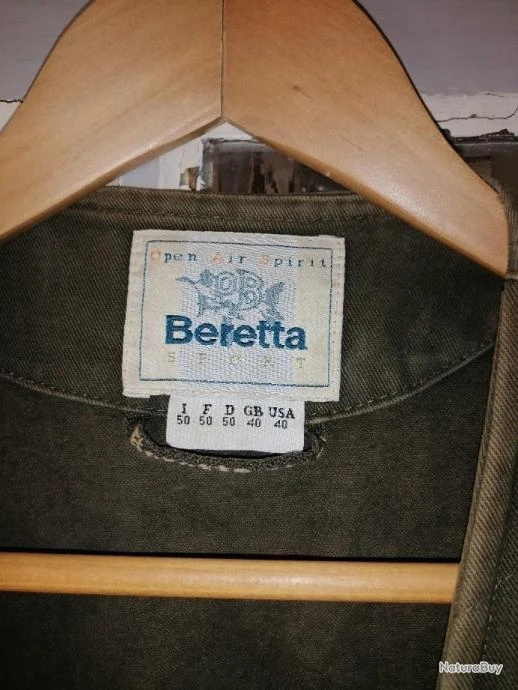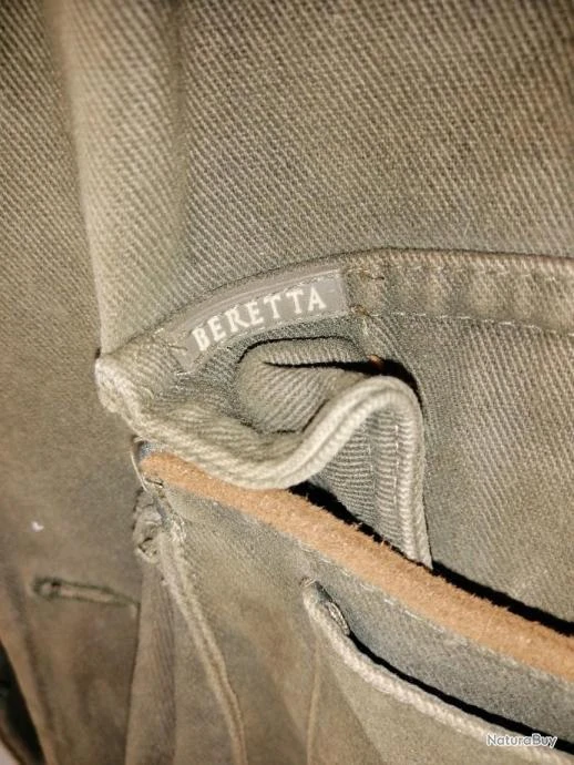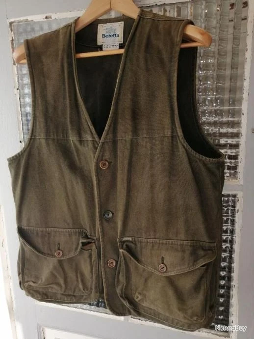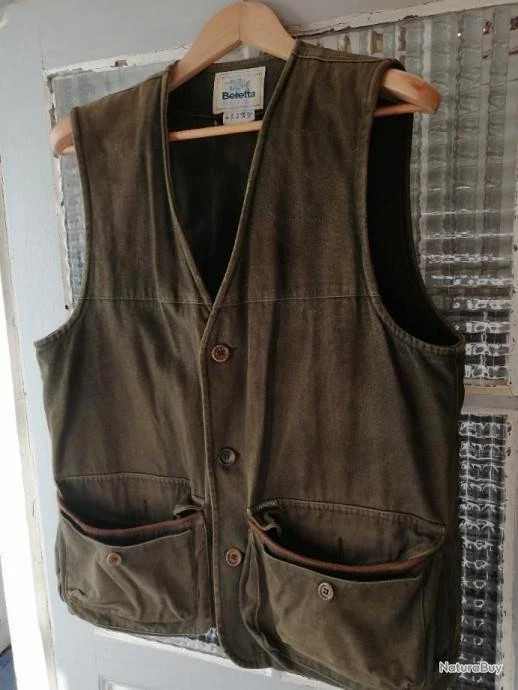 Beau gilet de chasse BERETTA en coton lourd – Taille 50 – 2 double poches avant gansées daim avec cartouchières – Grand carnier à scratch – Très beau gilet de chasse BERETTA « à l’ancienne ».