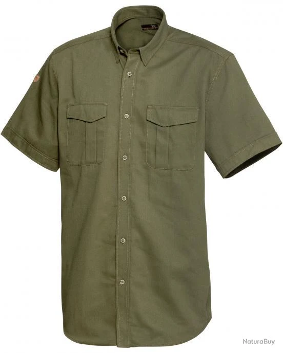 Chemise de chasse Parforce durable à manches courtes, de couleur olive en pur coton doux pour la peau. Deux poches spacieuses à rabat sur la poitrine offrant un espace de rangement pour les ustensiles les plus essentiels.