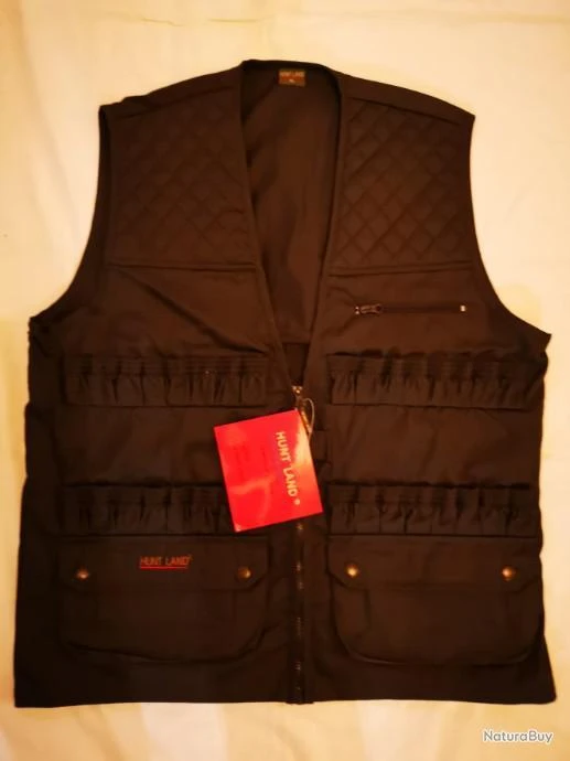 Gilet de chasse de marque HUNT LAND. 32 tubes, 2 poches à rabat à soufflet et boutons pression avec 10 tubes supplémentaires, 1 poche papiers à fermeture éclair, 1 poche carnier dorsale lavable.
