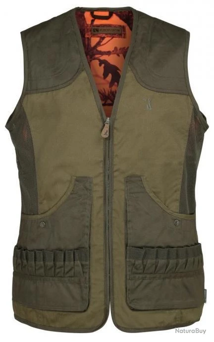 Ce gilet réversible dispose d’une face kaki et d’une face au camouflage Ghostcamo Blaze orange fluo. Il est équipé de renforts aux épaules (côté kaki), de 2 grandes poches fermées par pressions avec 2 rangées de cartouchières (balles et plombs) de chaque côté, d’un anneau porte gibier et d’un carnier doublé pvc au dos (côté kaki).