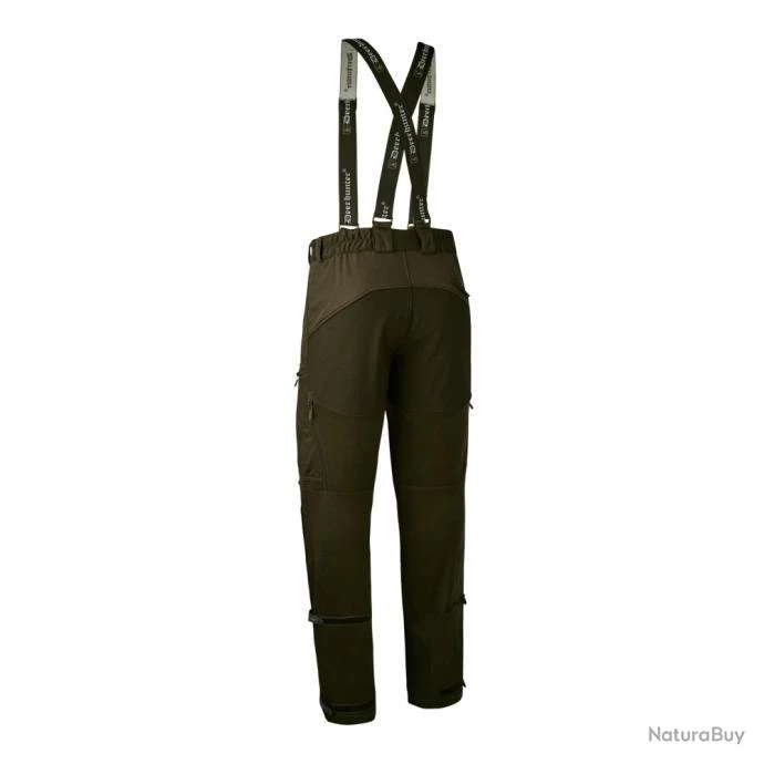 Le pantalon Excape kaki Softshell de chez Deerhunter possède une taille Ă©lastique et des bretelles amovibles, conçues pour une coupe confortable et sĂ»re. Il offre une multitude de rangement avec deux poches avant zippĂ©es et deux poches ergonomiques sur les cuisses, toutes deux dotĂ©es d’une technologie impermĂ©able pour que vos objets de valeur restent bien au sec pendant votre partie de chasse.
